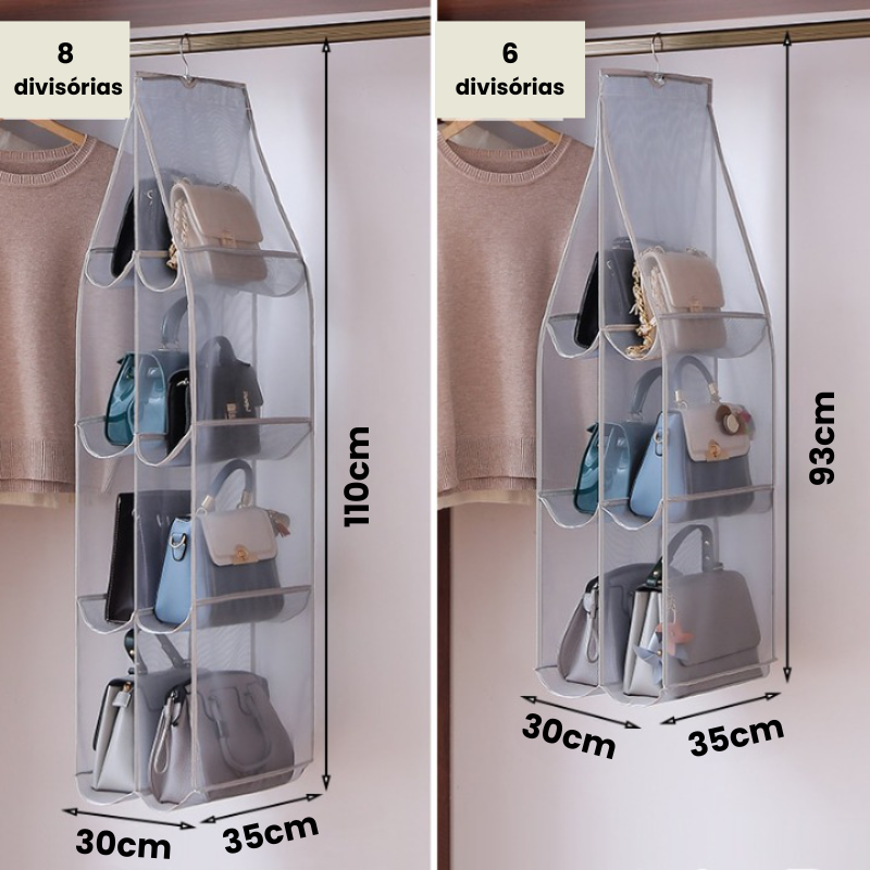 Este organizador compacto é uma solução eficaz para otimizar o espaço e manter suas bolsas sempre prontas para uso.