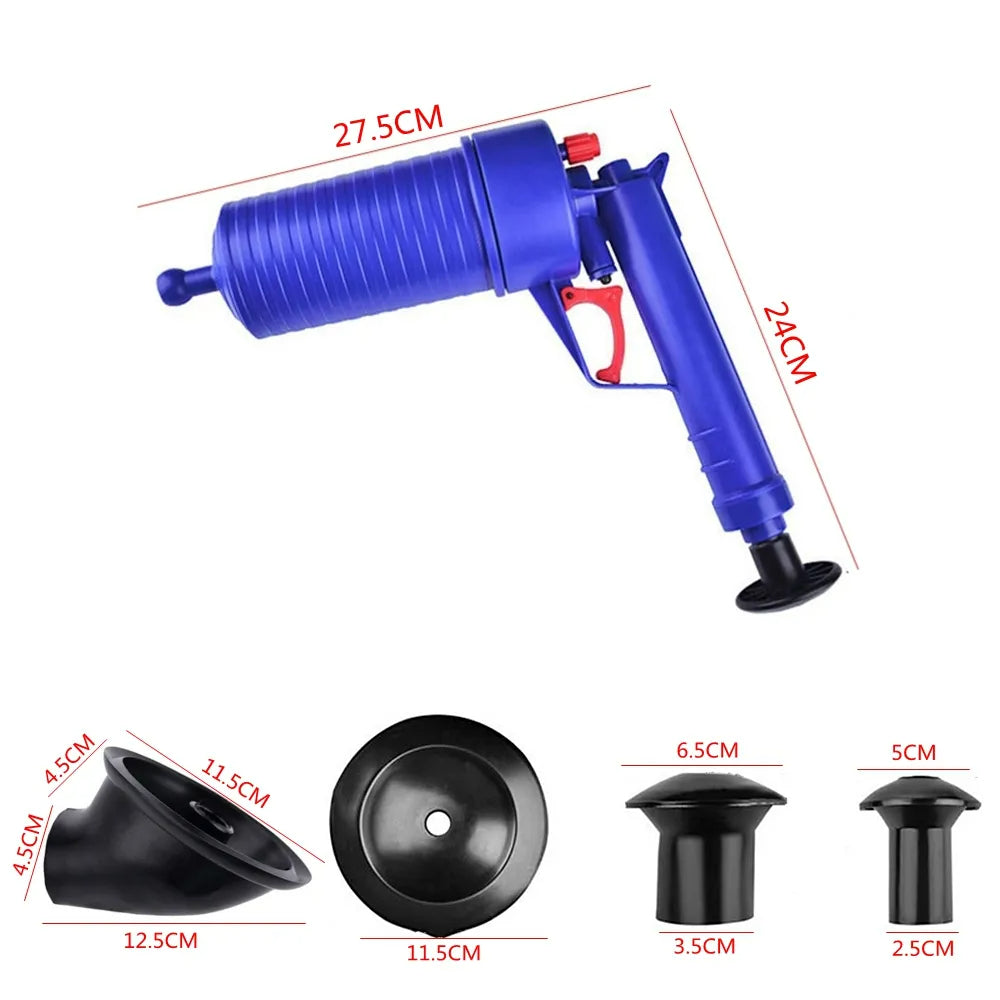 Como funciona? Basta bombear o desentupidor para criar pressão e acionar o gatilho. A alta pressão do ar faz o resto, de forma segura e eficaz.