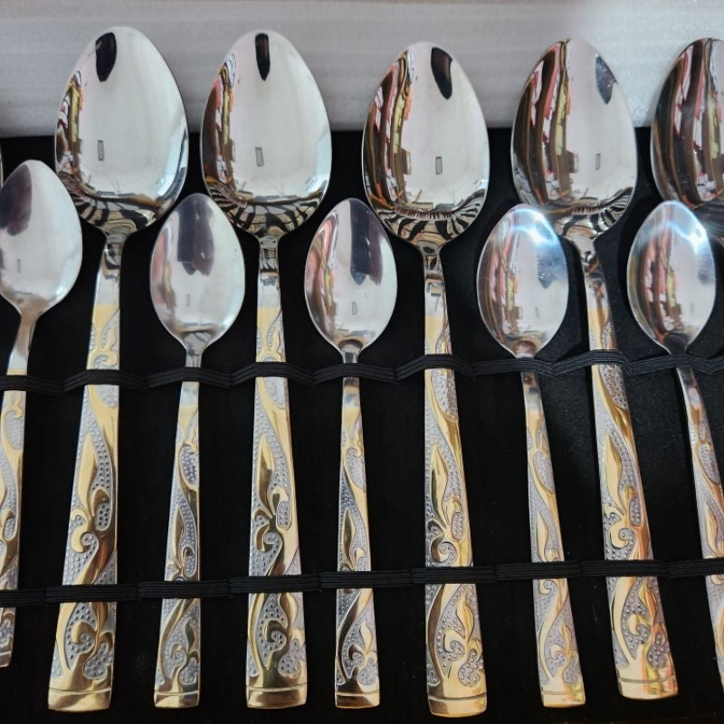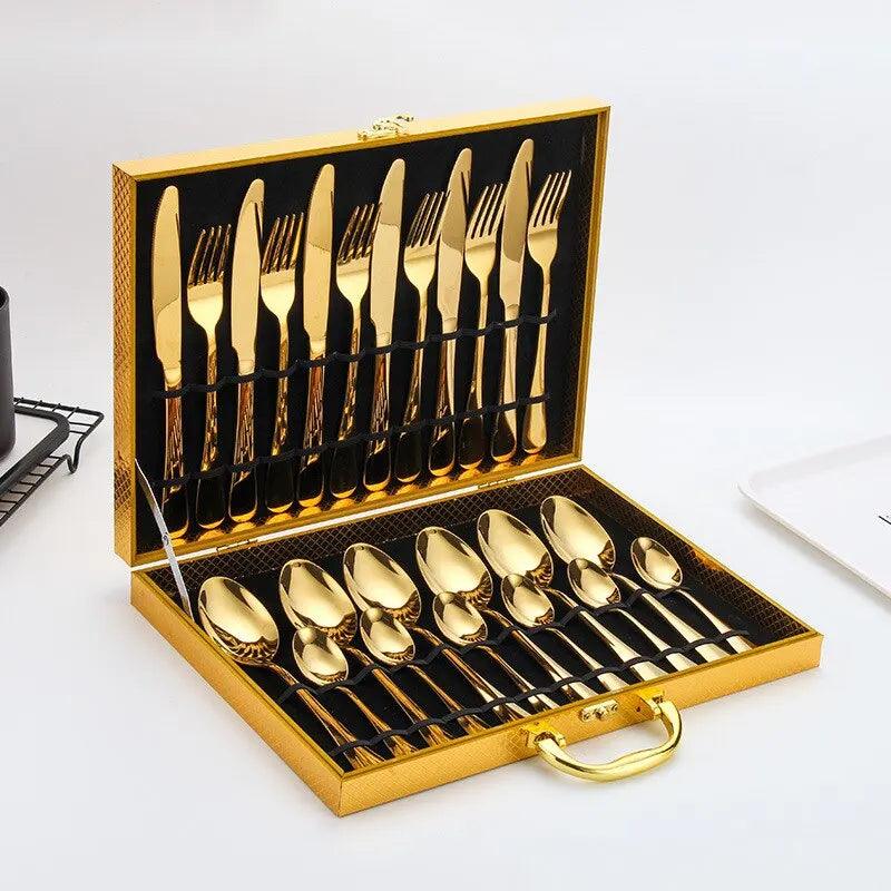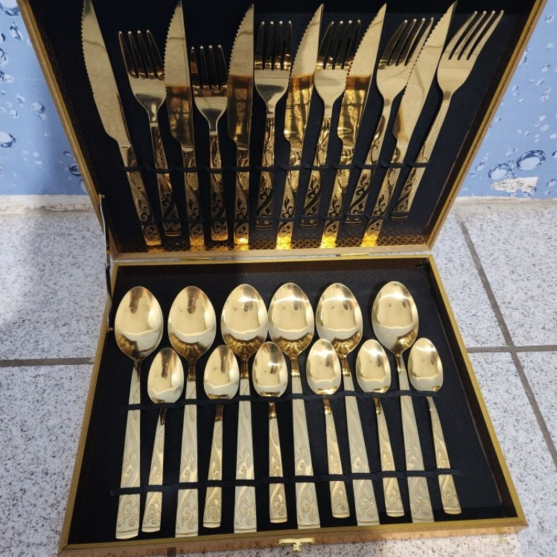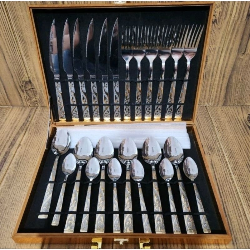 Feito de aço durável, o conjunto inclui facas, garfos, colheres e colheres de chá, além de uma caixa de madeira para armazenamento. Ideal para todas as ocasiões, adicione um toque de sofisticação às suas refeições.